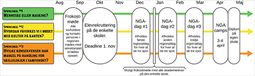 Spørgsmålene vil blive tonet i retning af henholdsvis naturvidenskab/teknologi, humaniora/sprog og samfundsvidenskab/business. Alle 3 spørgsmål i hver region fordyber sig med hver tre regionaldage på skiftende gymnasier og en afsluttende regionsamlende 2-dages camp, som er tilrettelagt i samarbejde med AAU. Næste års NGA vil komme til at se ca. således ud i hver region.